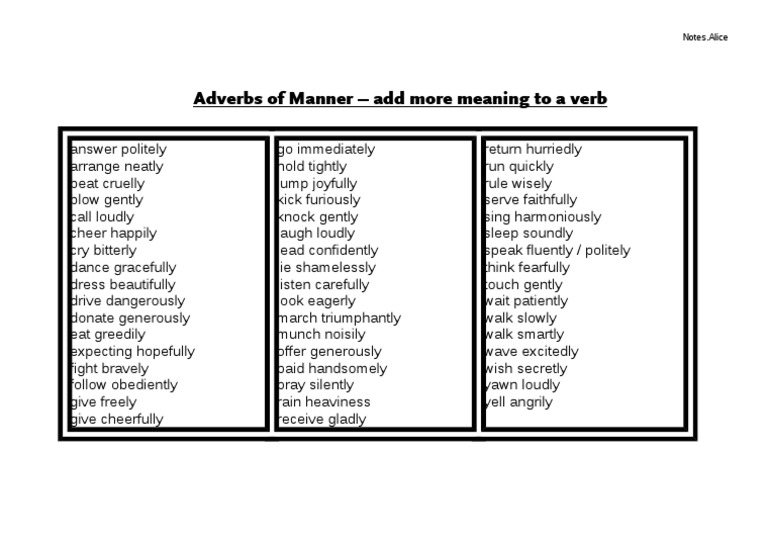 Adverbs of manner adverbs of manner answer the question 'how' or 'in what manner'. In a way that sent it off to the side of the court the official turned the timer clockwise. An adverb of manner is an adverb (such as quickly or slowly) that describes how and in what way the action of a verb is carried out. Adjectives vs adverbs of manner. Adverbs of manner help us to express how we do something.